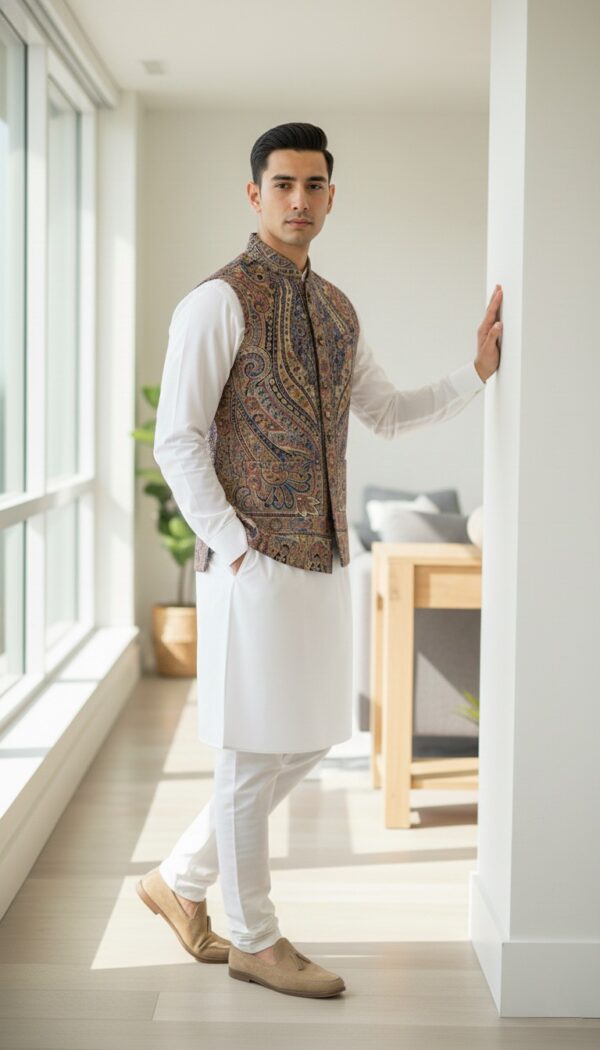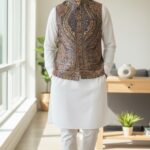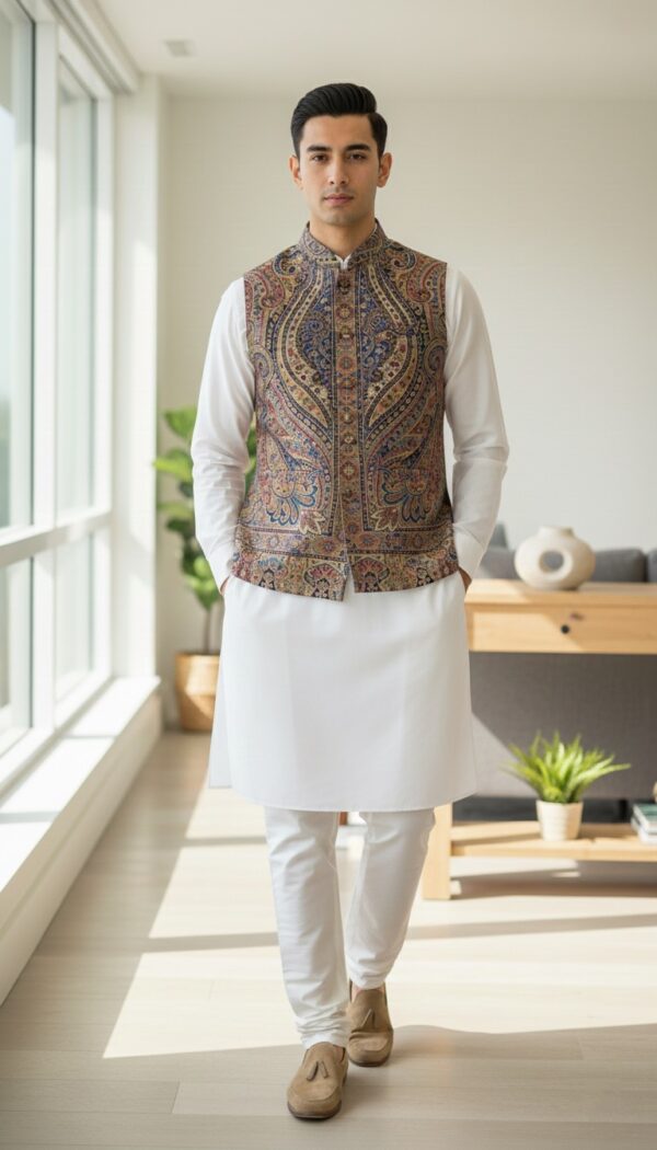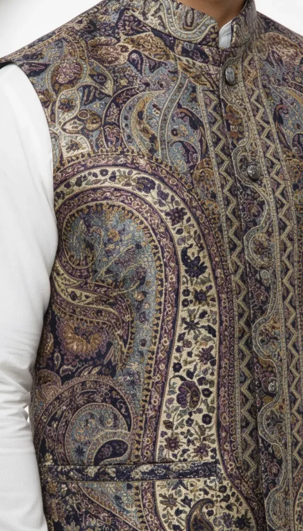 Inspired by traditional craftsmanship, this Premium Kani Waist Coat by Zibreqaan is made from finely woven fabric that delivers both comfort and sophistication. The structured silhouette and intricate texture make it a standout piece for weddings, celebrations, and cultural gatherings. A perfect blend of heritage design and contemporary tailoring.